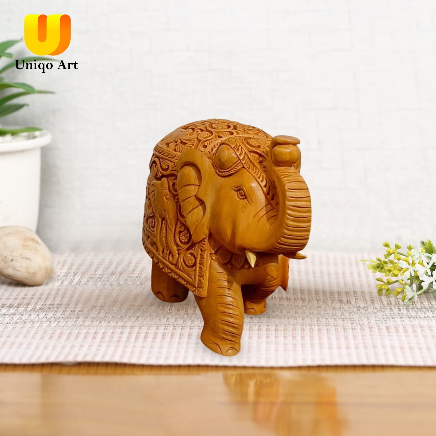 Embrace tradition and artistry with this exquisite hand-carved wooden elephant by Uniqo Art. Featuring a raised trunk—a symbol of good luck—this showpiece brings a blend of spirituality and elegance to your home or office décor.