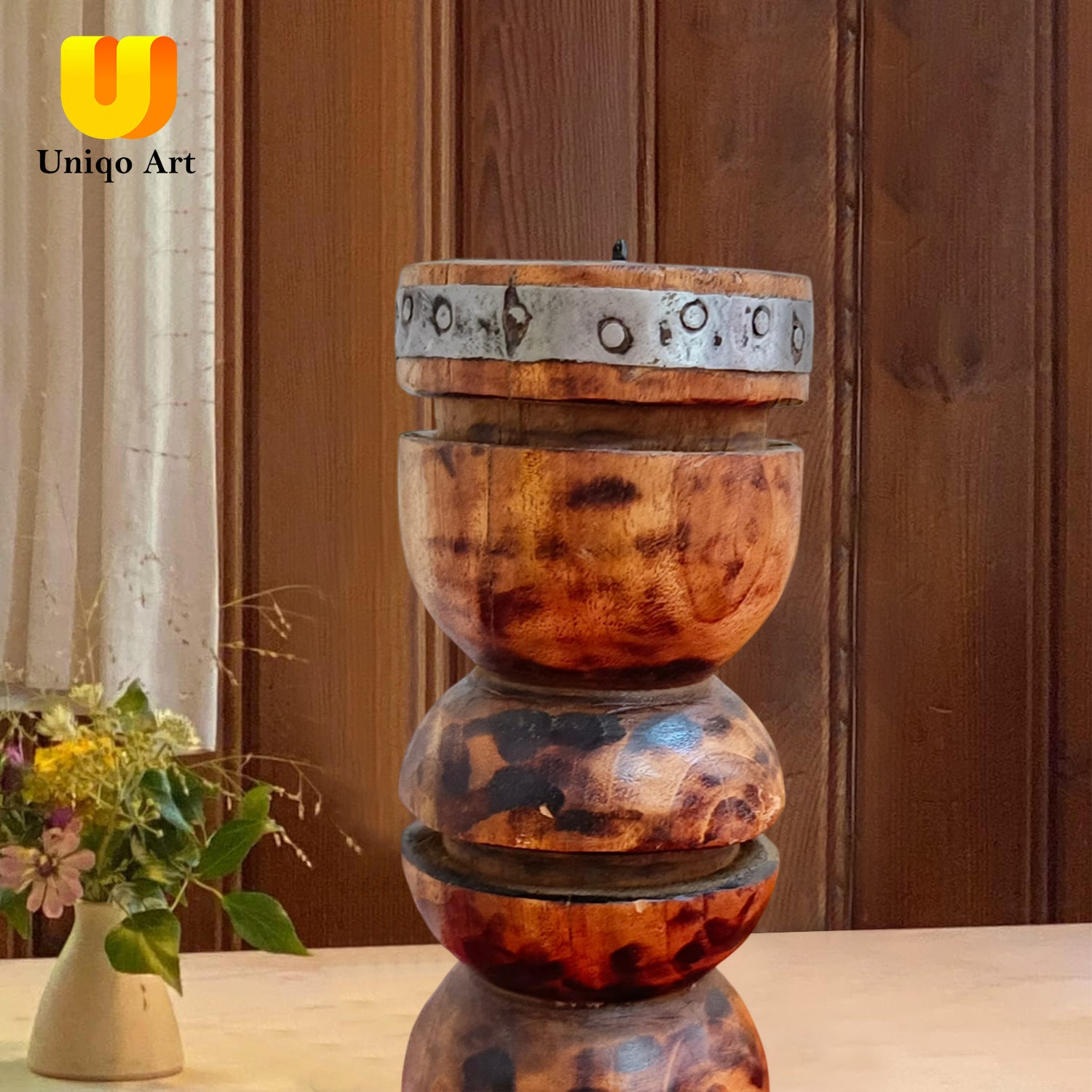 Uniqo Art Handicraft Wooden Pillar Candle Stand – Hand Crafted Wood Candle Holders for Living Room, Table Centerpiece Set of 2